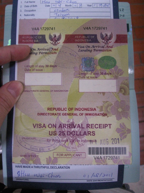 在該國30天內可辦理25美元落地簽。由於我們在印尼停留時間為30天,恰好為落地簽證的極限,因此到達機場後辦理落地簽證即可,不需要事前在台灣辦簽證。我和哈姆都是第一次到印尼,搞不清楚落地簽怎麼辦,結果先去排出關,排一排被叫去遠方位置比較空的隊伍,又被檢查員退回護照,用一連串怪怪英文叫我們去買VISA,阿咧VISA是啥鬼?在附近華僑的熱心告知+自行推測下,VISA指的應該就是落地簽,可是要去哪裏辦呢?又走回剛開始排隊的地方,發現有幾個孤零零沒有人光顧的窗口,牌子上寫著「VISA ON ARRIVAL」,原來就是辦理落地簽的地方…。所謂落地簽,交出25美元或者250000印尼盾(當時匯率)即可獲得閃亮亮VISA一張,可以一起付,但是不找零唷!然後拿著落地簽、護照、入境表格去排隊出關,將東西交給海關,海關會把VISA的貼紙貼到護照上,並且蓋入境章。已經有VISA的旅客則前往直接蓋章的海關處,可以比較快速通關(也就是我們中間被騙去排的那個...)。也有可能被問一些問題,例如入境目的、職業之類的簡單問題。由於我們並沒有被告知在印尼的住宿地點,只知道接下來大部分時間都停留在茂物,因此住宿地點的欄位是空的,和檢查員比手畫腳抽絲剝繭,外加請旁邊的華僑幫忙翻譯之下…,我勉強掰了個MAOWO,結果他們完全搞不懂這是哪裏,還問我這是旅館名稱嗎,結果還在這樣混亂之下檢查員大發慈悲讓我們過關了…!事後才知道原來茂物的英文竟然是「Bogor」,差太多了吧你!